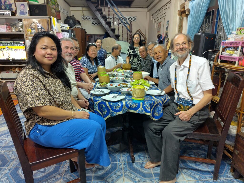 Lundi soir (24.2), nous apprenons la visite à Savannakhet d’une famille laotienne de France que je connais bien. Dara et Phetsamone sont un couple de Laotiens de Savannakhet partis comme réfugiés après 1975. Accompagnés d’une de leur fille et son mari, ils reviennent pour la première fois au pays. Nous nous retrouvons pour un repas en commun chez Phouvong, un des responsables de l’Église d’ici. Dara et Phouvong étaient dans le groupe de jeunes de l’Église de Savannakhet alors que je fais mes premiers pas au Laos… et ils évoquent quelques souvenirs musicaux de l’époque.