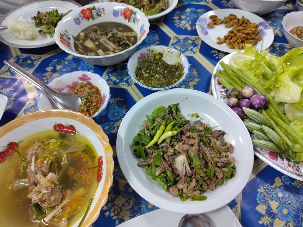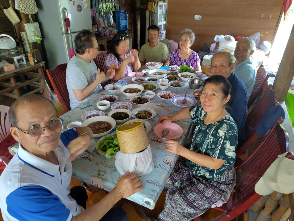 Et puis ce sont Dara et famille qui débarquent. Comme de juste, sans s’annoncer. Mais ils avaient tout de même amené quelques victuailles, et nous partageons un beau repas ensemble sur la véranda, dans la convivialité laotienne proverbiale que je connais…