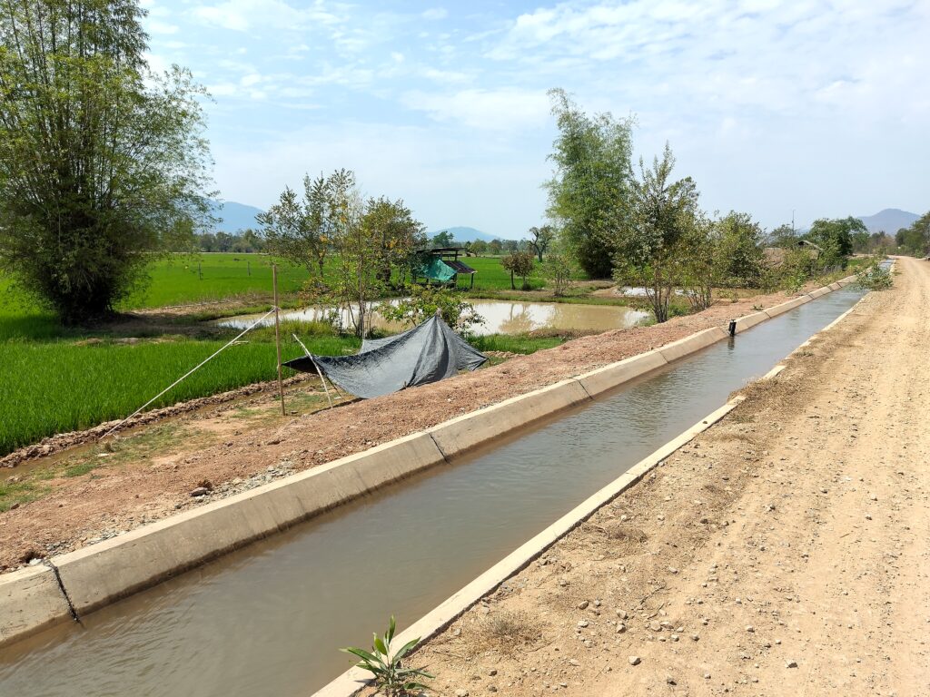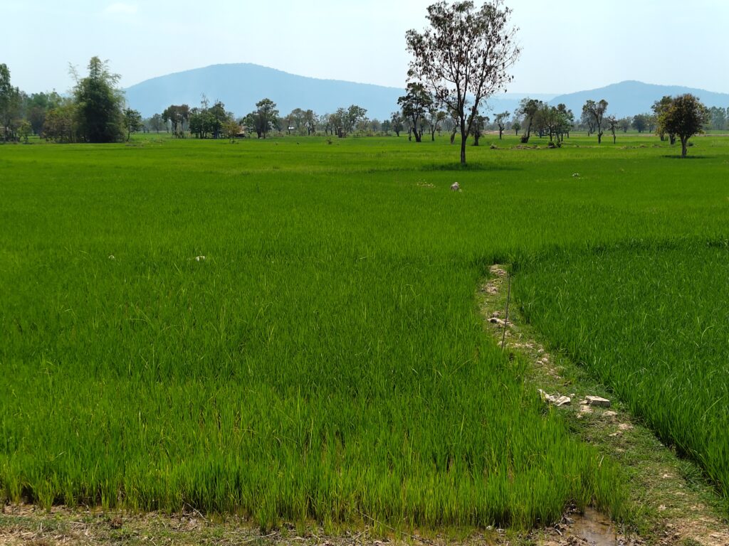 Dans tout une région (depuis Khongsédone et peut-être sur une trentaine de km), la proximité de la rivière a permis d’irriguer de grandes surfaces, avec de belles rizières vertes en contraste avec le paysage desséché ailleurs. Un arrêt photo s’impose…